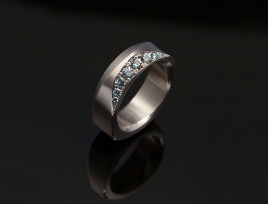 Även när det gäller faden går det att göra på fler olika sätt. I exempel nummer två nedan visar en ring i vitt guld med fadenfattade etiska safirer och färgade blå diamanter. Tyvärr slipar man inte riktigt små safirer så vi fick blanda i de färgade diamanterna för att fylla formen av fasetten på ringen.