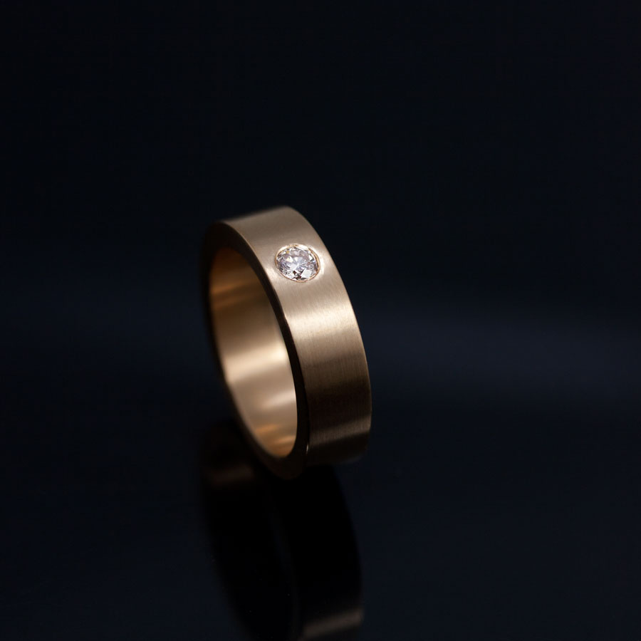 I det första exemplet nedan sitter stenen med så kallad riven kant. Det betyder att lite material runt hela stenen smids ner över den. Stenarna ligger då som separata prickar med en blank fasett runt omkring. Man kan gärna lägga flera stenar i olika storlek bredvid varandra, men det här är också det naturliga sättet att sätta en enda sten i en ring. Men då får man tänka på att ju större en sten är desto djupare är den, och för att få plats med en stor sten som här så behövs ett tjockt material i själva ringen!