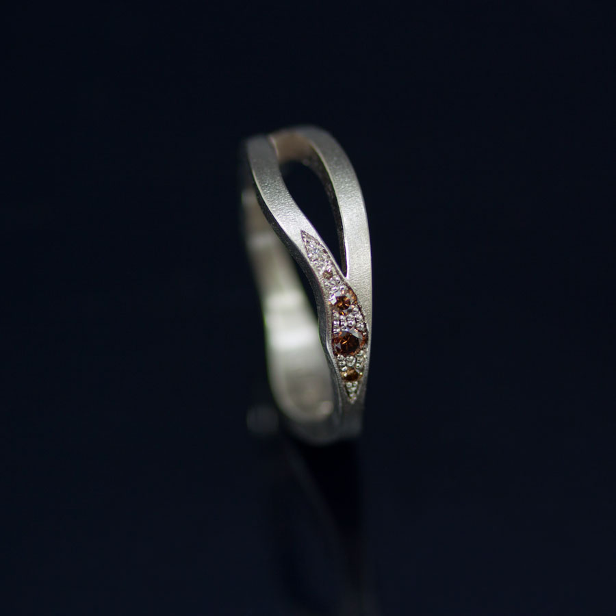 Den tredje ringen är av vitt guld, men något i fotograferingen får det att se ut som silver. Den är intressant därför att fattaren här tillverkat fler extra kön som hen lagt mellan stenarna. Det ger ett gammaldags, arbetat intryck särskilt tillsammans med de mörka kaffediamanterna.