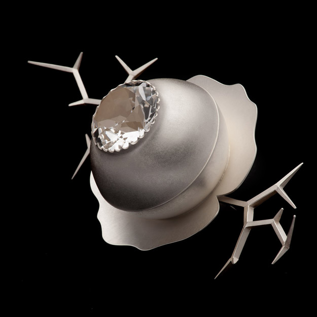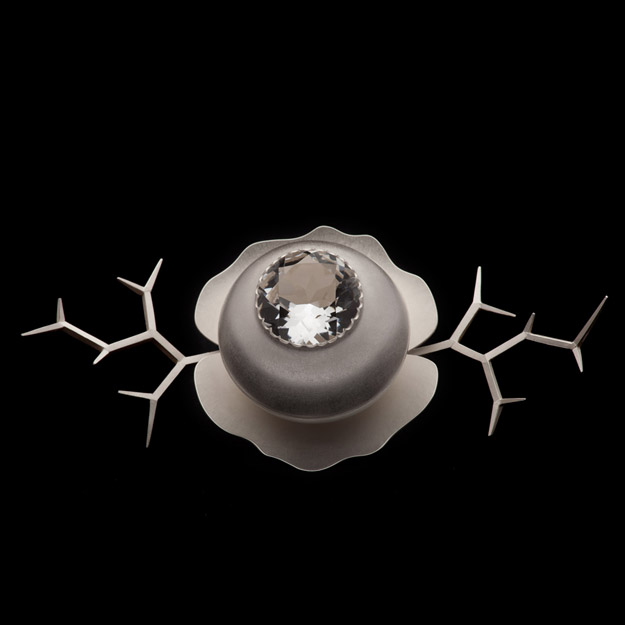 Senast var hon aktuell med utställningen ”Nästa gång blir jag ett träd” på Nutida Svenskt Silver. Där visade hon korpus, men även stora silverringar med maffiga bergskristaller.