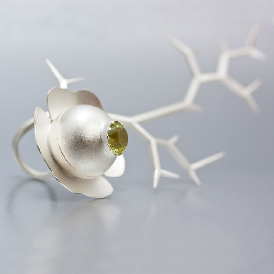 Halssmycke i silver av Erik Tidäng, Förgyllt armband och silver glas av Pernilla Sylwan och en ljusskulptur av Judit Fritz.