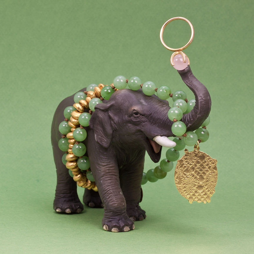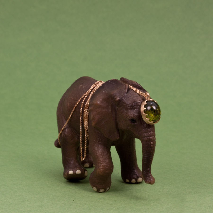 Lilla elefanten med Pertonellas halsband i guld och turmalin.