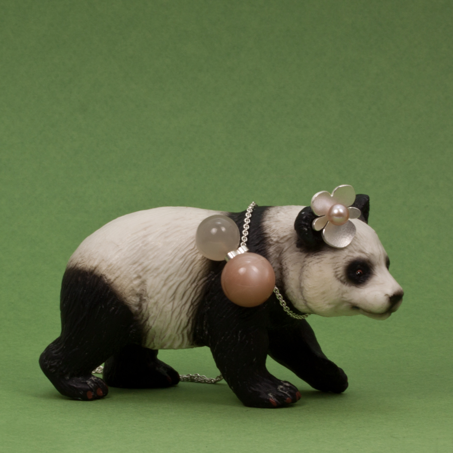 Giraffen bär Pernillas örhängen och Peronellas halsband. Båda i silver och sötvattenspärlor.